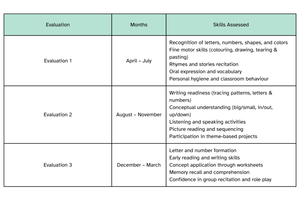 Evaluation Policy Evaluation Policy Exam Pattern for Pre-Primary ClassesPre-Primary students are assessed through continuous observation, fun activities, worksheets, and interactive learning.Evaluation System (April – March) Exam Pattern for Classes I–XII
